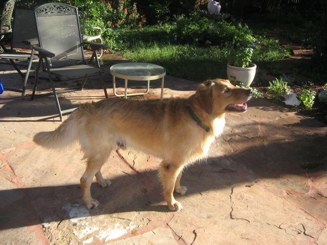 Traveler can swim, but what he really loves is lying on the tanning shelf and just soaking. One time he was lying there and when I came over to pet him he rolled on to his tummy (forgetting where he was) and rolled right into the pool for a little swim. Too funny! If his ball goes in the water, he waits until it is almost to the edge, then just plops in after it. He’s happy to let you towel him off after a swim, does well with handling of his feet and paws, and loves to be brushed.