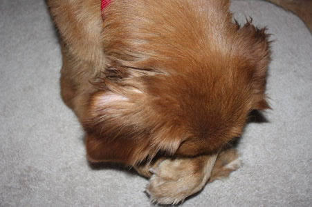 Troy mostly ignores the cats—barely even noses them, sleeps right next to them on the floor. The other day, though, we caught him playing with Archie, our young tom cat. Archie loves to lie on the floor with his tummy showing, and Troy crawled over and started licking the cat’s tummy and head. This turned into some gentle play, until finally Troy had the cat pinned, with one foreleg across the kitten’s chest. Archie noticed us watching at this point and gave the most plaintive look and small meow, like “What do I do now?” Troy started to get a bit rougher at this point, so the cat “redirected” him very neatly and they broke their wrestling hold and went to their corners. Archie didn’t run away, though; he hopped onto a chair so he could be face-to-face with Troy, and they touched noses. Finally Troy lost interest and lay down.