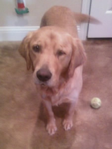 Just as cute and dainty as her name, three-time mom Trinket came to GRR when her owner could no longer care for her. That owner got her as a young adult dog—at which point Trinket had already suffered damage to one of her eyes. (When our vet examined her, he found that the eye just isn’t there; the socket is simply filled with connective tissue. No treatment is needed, and it doesn’t seem to bother Trinket a bit.)