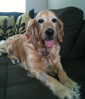 The owner arrived at the vet’s leading a droopy, panting Golden who was clearly very ill. “She’s been in heat for three whole weeks. Whatever the matter is, I can’t afford to fix it. Please put her to sleep.” A quick exam revealed that Brandy wasn’t in heat at all – instead, she was suffering from pyometra, an infection of the uterus that causes pain, lethargy, inflammation, and a purulent vaginal discharge. The exam also revealed that Brandy was a sweetheart despite her dire condition! “Just sign her over to me,” said the vet. “I’ll find someone to take her.” Before the ink was dry, Brandy was whisked into emergency surgery to remove her massively infected uterus. And two days later, she came to GRR. For the first day or so, the poor gal was very sore and tender, needing help getting in and out of the car and a boost in her pain meds. But a few days after that, her foster mom came home to find her happily nestled on the couch. Clearly feeling better! And now: