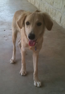 By the way, Groovy isn’t just little in age – he’s little in size, too, weighing just around 30 pounds at around one year old. So he won’t be a standard-size Golden when he’s all grown up, but, “I don’t see any other breed that stands out,” says his foster mom. “He is definitely underweight, and he has fairly long legs and decent paws for his size (who knows what kind of nutrition he was getting?!). He has a longish snout (but then so does my registered Golden). His fur and pantaloons and tail feathers look Golden (he is very light-colored). He may be one of those ‘mini’ Goldens, but he will look so much better with some groceries on him & a healthier, thicker coat.”