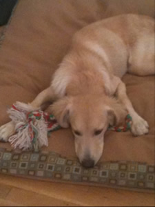 Great news! What a difference not even a day makes. Groovy and Freya, who’s about the same age, are best buds and he is a wiggly, playful pup again with a wagging tail. They are two peas in a pod at the same height... just different colors. He LOVES to wrestle! He is a little worried about petting, but he will lick our hands, and he wags his tail when he does come up to us. I think he just needs a little time to trust people.