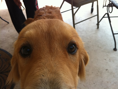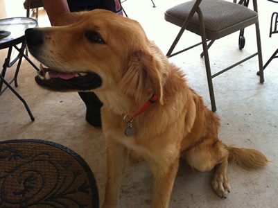 Moon Pie is pale gold, with great big feet and long legs – we suspect he’ll be a husky guy when he’s all grown up. Pop Tart is a lovely creamy blonde all over. With their wavy fur, sparkling white teeth, and soulful dark eyes, they’re beauties. They’re also probably about 25 percent Great Pyrenees—when you first look at them, you think “Golden,” but a few little traits (coat texture, single dewclaws on their hind paws, darker whiskers on Moon Pie) hint at a touch of something else. Never mind! They’re both sweet as can be. Of course, as pups, they can be very bouncy, but they’re quickly learning that they don’t get pets without “four on the floor.” And Pop Tart is, her rescuer says, “a mud monster!” She adores wallowing in a kiddie pool and then rolling enthusiastically in dust. Her foster family has been instructed to be prepared to run interference.