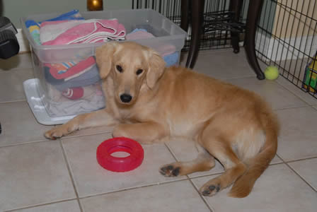 Buttercups, sweetpeas, violets and jasmine…. in SEPTEMBER? That’s exactly right! Not as unusual as it sounds when you take into account that THESE pretty blossoms are adorable Golden puppies. All four girls were brought to the same South Texas shelter as strays, but beyond that, we don’t have a clue where they came from… or even if they all came from the same place. (Maybe from a backyard breeder clearing out the excess “inventory”?) They’re all young, but two of them (sisters Buttercup and Sweet Pea) are tiny, just 7 or 8 weeks old. Fine-boned, dainty Violet is a bit older, maybe 10 to 12 weeks; and Jasmine is the oldest, at 4 or 5 months.