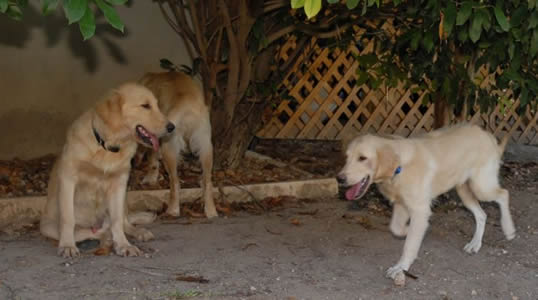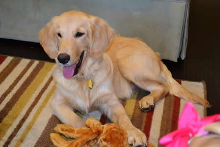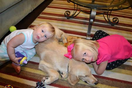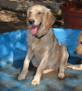 More what? More Goldens, of course! The very same day that one GRR team was motoring north for the Lockney puppy mill rescue, Jeanae was heading far south to pick up five MORE Goldens. One of them, baby Marigold, is a likely sister to our “Flower Girls” Buttercup and Sweetpea; somehow, she showed up at the shelter a few days later. As for the others—a few days earlier, Lisa had spotted a Craigslist posting featuring four pretty 5-month-olds. “I have 3 females (Summer, Belle, and Faith) and 1 male (Rocky) . Unexpectedly, this litter crept up on us. We really are just looking for a good home for these puppies.” When we contacted him, the owner was so relieved! He couldn’t support all those pups properly on his own (he had several more Goldens, too) and agreed to hand the quartet over to the same shelter where Marigold was staying, so that we could collect everyone at once.