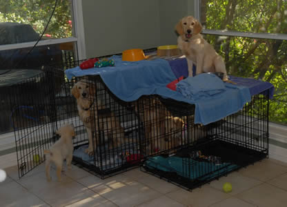 The pups aren’t alone except when we take our weekly trip to the grocery store when all seven Goldens are confined to the kitchen. The pups have been angels; we’ve never come home to any disasters, items/furniture chewed, etc. They have no anxiety fears being left alone.