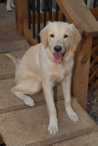 Faith is an excellent car rider; she’s already had lots of road trips, moving foster homes, going to the vet, and just going for fun drives. She gets along great with our pack of five other GRR dogs: three girls, two boys. In fact, Faith and Summer have both decided their favorite family dog is Mojo, a humongous Golden/Great Pyrenees mix whose first prospective forever home declined him bcause he “played too hard.” Indeed he does, as we sometimes have to calm him down when he plays with our pack—he doesn’t understand his power and size and can get carried away. With these pups, though, he is a gentle giant and they adore him. They crawl all over him, lick him, antagonize him and he just lies there and lets them have their fun, once in awhile gently poking back, all in playful fun.
