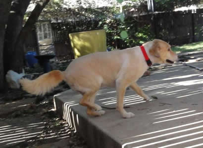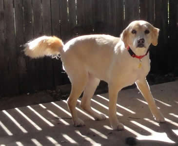 *Editor’s note: The vet noticed that Heidi was limping slightly and holding her tail up a bit, and thought she may have twisted her back. She headed off for a chiropractic adjustment, but X-rays revealed that Heidi had a pelvic injury (hit by a car?) a long time ago. The damage was surgically repaired: the right femoral head (that is, the top “ball” part of her thighbone) has a pin in it. The vet says, “The reason Heidi holds up her tail is that the lower part of the tail & the sacrum healed that way. She uses short strides in her hind legs as they won’t extend much. Her hamstring muscles are somewhat atrophied. She is doing well, considering!” We’ll start Heidi on Synflex (a glucosamine/chondroitin supplement), as well as fish oil caps, and add Rimadyl or another NSAID later on, if needed.