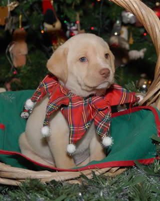 … and now, we’re more than thrilled to be able to watch seven happy, healthy-looking puppies playing and wrestling with each other. It's been two weeks since we've heard any coughs, or seen any discharge. We still have them under a microscope, watching for any new symptoms, but at the moment it looks like they’ve made it through their illness, and are now robust little kids. And hungry! (The reason they look so solemn in their holiday duds is that they’d just finished stuffing themselves and were feeling rather drowsy!)