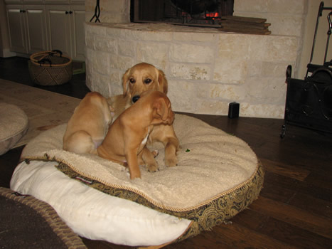 … and now, we’re more than thrilled to be able to watch seven happy, healthy-looking puppies playing and wrestling with each other. It's been two weeks since we've heard any coughs, or seen any discharge. We still have them under a microscope, watching for any new symptoms, but at the moment it looks like they’ve made it through their illness, and are now robust little kids. And hungry! (The reason they look so solemn in their holiday duds is that they’d just finished stuffing themselves and were feeling rather drowsy!)
