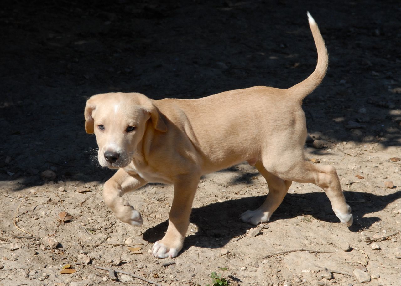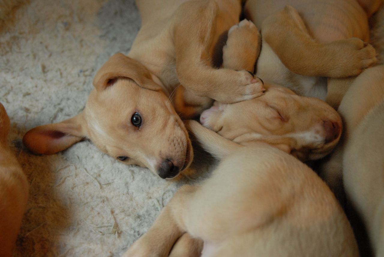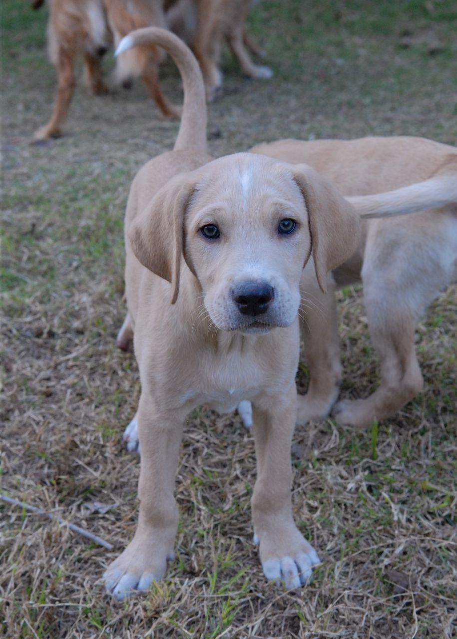 Butterball lives up to his name, and has a cute little round belly. He is very sweet, and is a beautiful light caramel color with the shorter fur. He is a very easygoing fellow, loves to snuggle in with the other pups, and loves to come and say hi as soon as we go in their enclosure. He has white markings on the tip of his tail and some on his face as well. He is another cuddler.