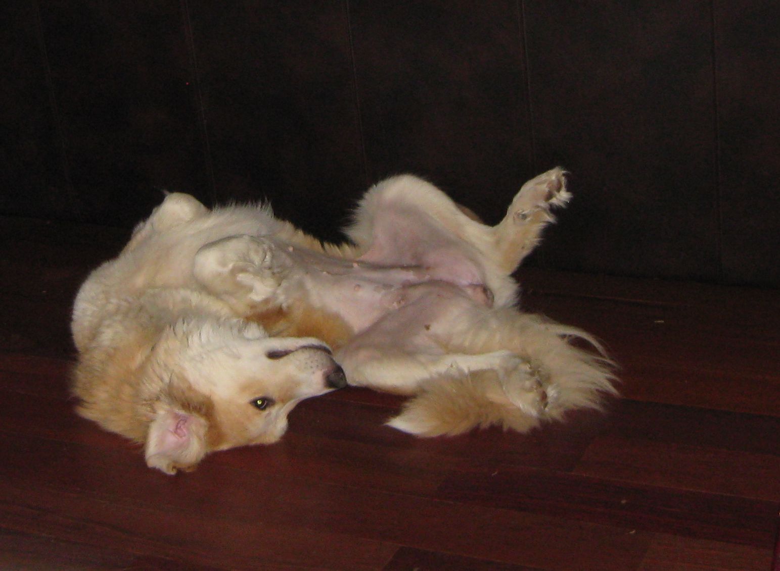 April 18: Do you have hands? Will you pet her? She loves you! Cassidy loves her people and looks for guidance constantly. She is a complete cuddlebug and will curl up with you wherever she can. She will follow you from room to room and just wants to be near you at all times. She is eating great -- 48 lbs and gaining! In fact, she’s figured out how to open the storage container for the dog food in the pantry. Sneaky li'l devil! Her nose is somewhat scabby and rough and some discharge - no worse than a dog with allergies! Cassidy is learning to SIT and WAIT to go outside. She's a smart little girl so teaching is fun. She likes to lie against the wall, roll halfway into the wall and then stretch her paws all the way in front of her to nap. She also loves to stick her head between your knees...which is cute, except when you're going up or down stairs!