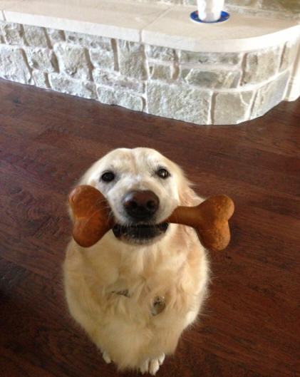 When the long-awaited storms rushed into Central Texas, they brought rain and hail and downed branches and power outages. And at a local shelter, just minutes before closing time, the severe weather blew something else in, too: a cheerful senior Golden with a real aversion to thunder. A yard dog most of her long life, Miss Katie had broken off most of her teeth over the years, trying her hardest to get indoors when the lightning flashed and the thunder cracked. “This time, she bent the metal frame on the doggie door our little Shih Tzus use to run inside,” said the owners. “We don’t want her to come in the house… and lately, since we’ve retired, we’re spending a lot of time away, anyway. We really need to find her another home.”