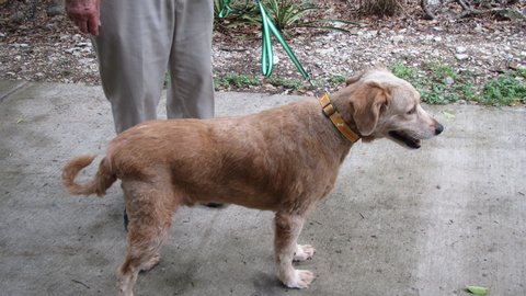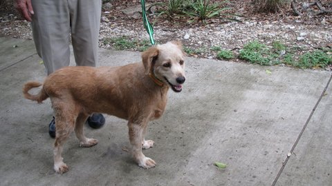 “Oh my! We know he’s a Golden, but right now he looks more like Cousin It from ’The Addams Family’ – or a sheepdog, or a chia pet… we wonder if he has EVER been brushed. We’ve never seen such a matted little dog.” The shelter warned us that Frankie needed grooming in the worst way, and they weren’t kidding. But they also said he was a sweetheart, and they weren’t kidding about that, either. “He’s a little small,” said intake volunteer John, “but what he lacks in size he makes up for with the display of an abundance of love. He liked to be hugged and he took the treats I offered ever so gently. He happily posed for his photo session. He is so ready for a clean-up – we can’t wait to bring him in.”