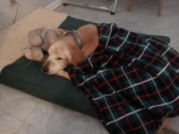 He is alert, wants to be with the other dogs, does not sleep for long periods of